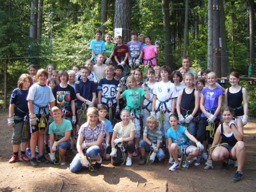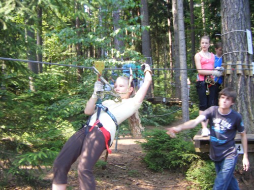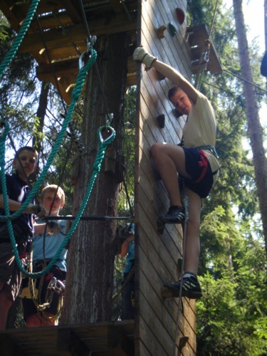 Einen besonderen Bonbon für die Schüler und Schülerinnen der Sportklassen 5 und 6 gab es zum Abschluss des Schuljahres 2009/2010 : eine Fahrt zum Kletterpark Hohenfelden/Erfurt. Mut, Ausdauer, Konzentrationsfähigkeit,Disziplin und soziales Engagement waren gefordert und die Schüler und Schülerinnen gaben alles. Verschiedene Niveaustufen im Kletterpark galt es zu meistern, Höhenangst musste überwunden werden, die Furcht vor schwankenden Brücken in 6m Höhe musste bekämpft werden und der innere Schweinehund an einer Kletterwand besiegt werden. Skateboarden in schwindelnder Höhe und Seilzüge vorwärts und rückwärts stellten eine besondere Herausforderung dar. So mancher Schweissfleck hatte bestimmt nichts mit den tropischen Temperaturen an diesem Tag zu tun. :-)