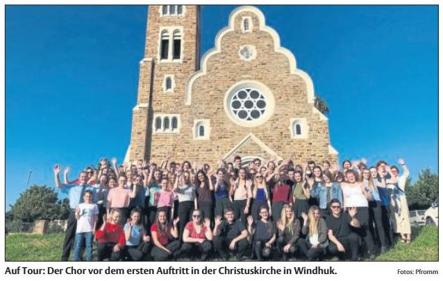 WINDHUK. Der Name ist schon wie eine Verheißung für die muntere Truppe. Afrika, dieser Kontinent fehlte noch. Namibia ist ein Sehnsuchtsziel des Chores der Modell- und Gesamtschule Obersberg um Ulli Meiß. Die jungen musikalischen Botschafter unserer Heimat, die sich schon um mehr als die halbe Welt gesungen haben, sind gestern Morgen nach 22 Stunden Flugreise mit Stopp in Katar in Windhuk gelandet. 8281 Kilometer von Bad Hersfeld entfernt. Eine seidige, fast samten anmutende Brise empfängt uns bei herrlichem Wetter und Temperaturen von Ende 20 Grad. Die meisten sind bewundernswert frisch nach anstrengenden Transfers. Jung und fit sollte schon sein, wer dann ohne Pause sofort die Hauptstadt Namibias erkunden will, um dann fröhlich am frühen Abend deutsche und internationale Lieder bei einem ersten Konzert in der eindrucksvollen Christuskirche zu präsentieren. Vorher haben wir noch prominent die Werbetrommel gerührt und einen Abstecher zum landesweiten Radiosender Hit Radio Namibia gemacht. Die Kollegen vom Funk interessieren sich sehr für den jungen Chor als deutsche Botschafter – ist Deutsch aufgrund der Kolonialgeschichte Namibias doch bis heute kulturprägend in dem südwestafrikanischen Land, in dem etwa 20 000 deutschsprachige Einwohner leben. Wie viele Eindrücke waren das also allein schon am ersten Reisetag?! Die jugendliche Frische steckt jedenfalls an; da zieht auch der Ü50-Begleiter klaglos, wenn auch etwas übermüdet mit.